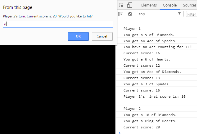 Game Design DocumentTerrain Tiles (448 KB)One of the first programs that I made back in 2012- this is a pure JavaScript version of Blackjack that uses the console log and alert prompts to display and get input from the user in a two-player game. It's nice to see how far I've come!