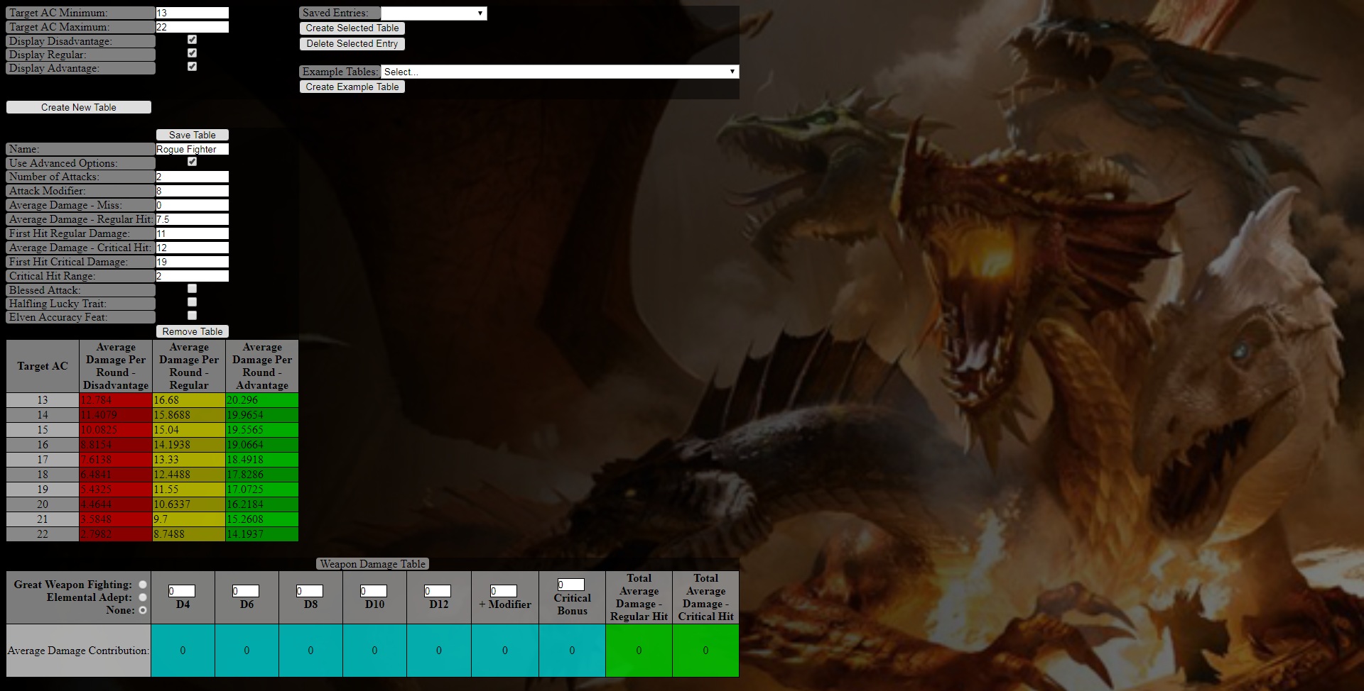 A tool for calculating expected damage output in combat for the 5th edition of the tabletop role-playing game Dungeons & Dragons (D&D). Great for analyzing character builds and planning combat encounters.