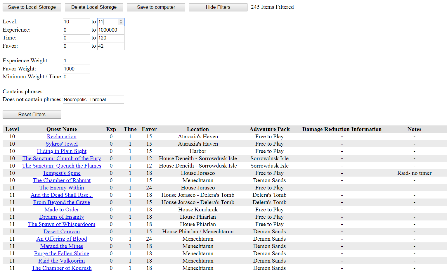Use NowSource Code (GitHub)While more of a personal list that I use and very tailored to that end, players of the MMO version of D&D- Dungeons & Dragons Online (DDO)- may find this sortable table of quests to be convenient.