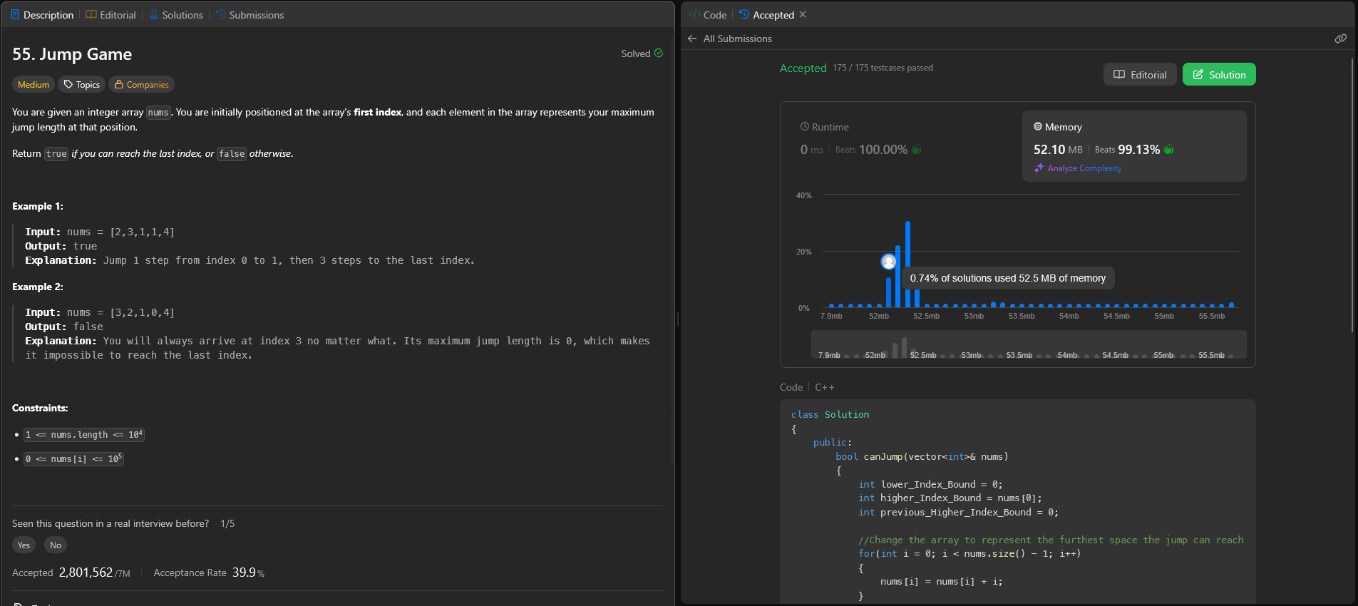 Next, we will loop over the vector going to the available space that is able to travel the furthest each time we jump until we either reach the end or aren't able to make any progress on that jump and return true or false accordingly.