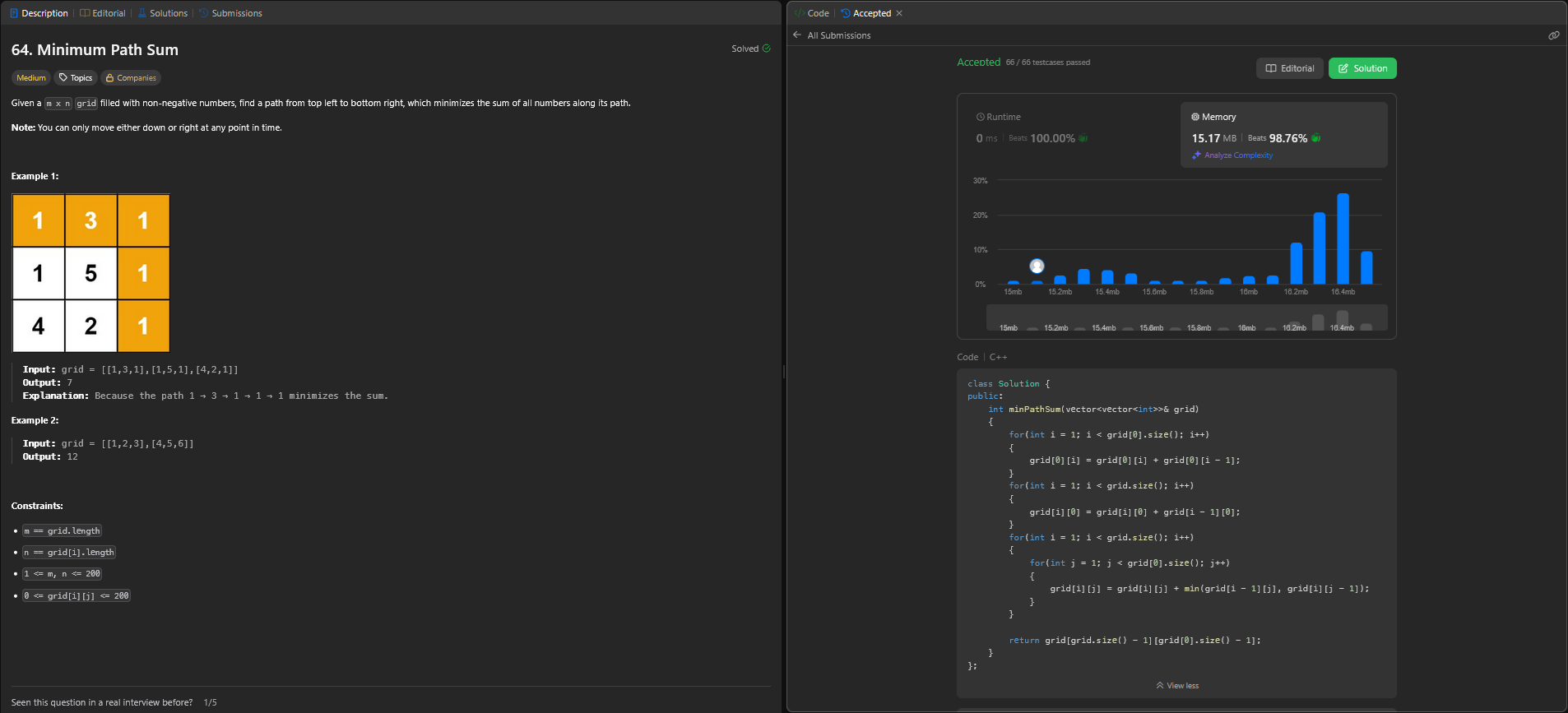 Play NowSource Code (2 KB)A LeetCode problem where you are tasked with finding the shortest path through a grid starting at the top-left and working your way to the bottom-right with each movement costing varying amounts to complete. The full problem can be found here.