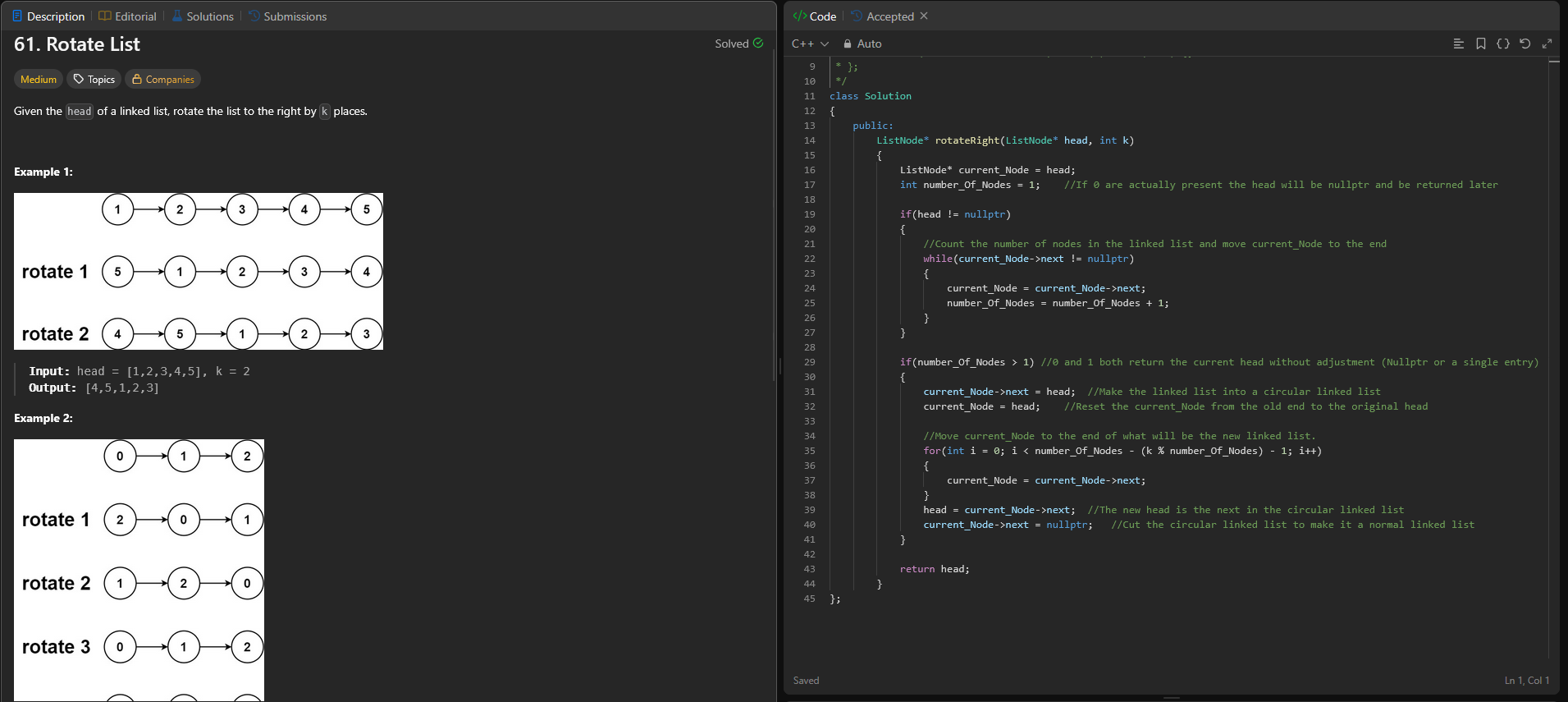 A LeetCode problem with the goal of rotating a linked list backward K times, with K potentially being fairly large. The full problem can be found here.