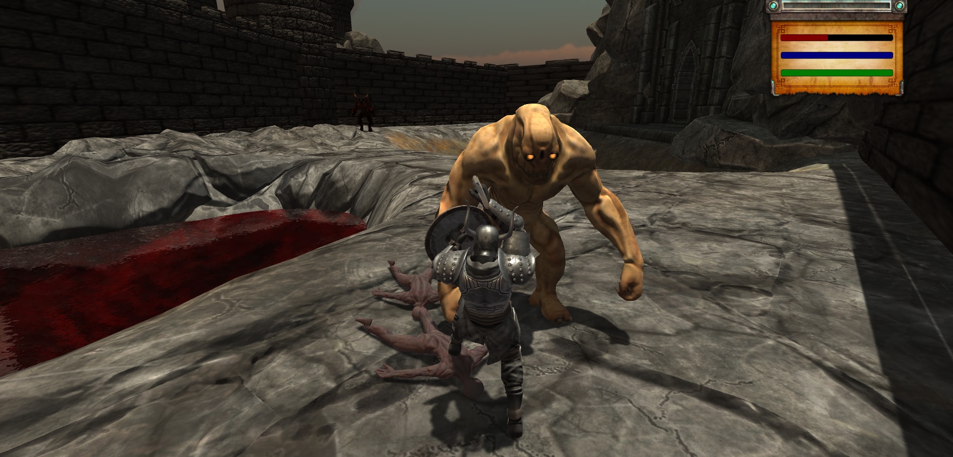 Game Design DocumentSource Code (Bitbucket ZIP, 314 MB)One level of a medieval fantasy combat game produced using Unity in my Advanced Game Programming class with one other programmer and a design team- many things are quite rough around the edges due to time constraints on the project. I worked on the enemy AI, menus, inventory, and laying out the levels, along with assisting on any other issues that arose.
