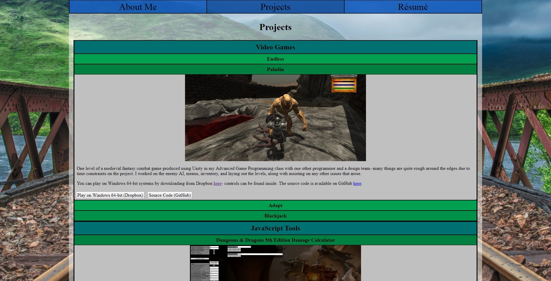 The background images are available for free at the following external locations: About Me, Projects, Résumé. Source code for the website can be found on GitHub here.