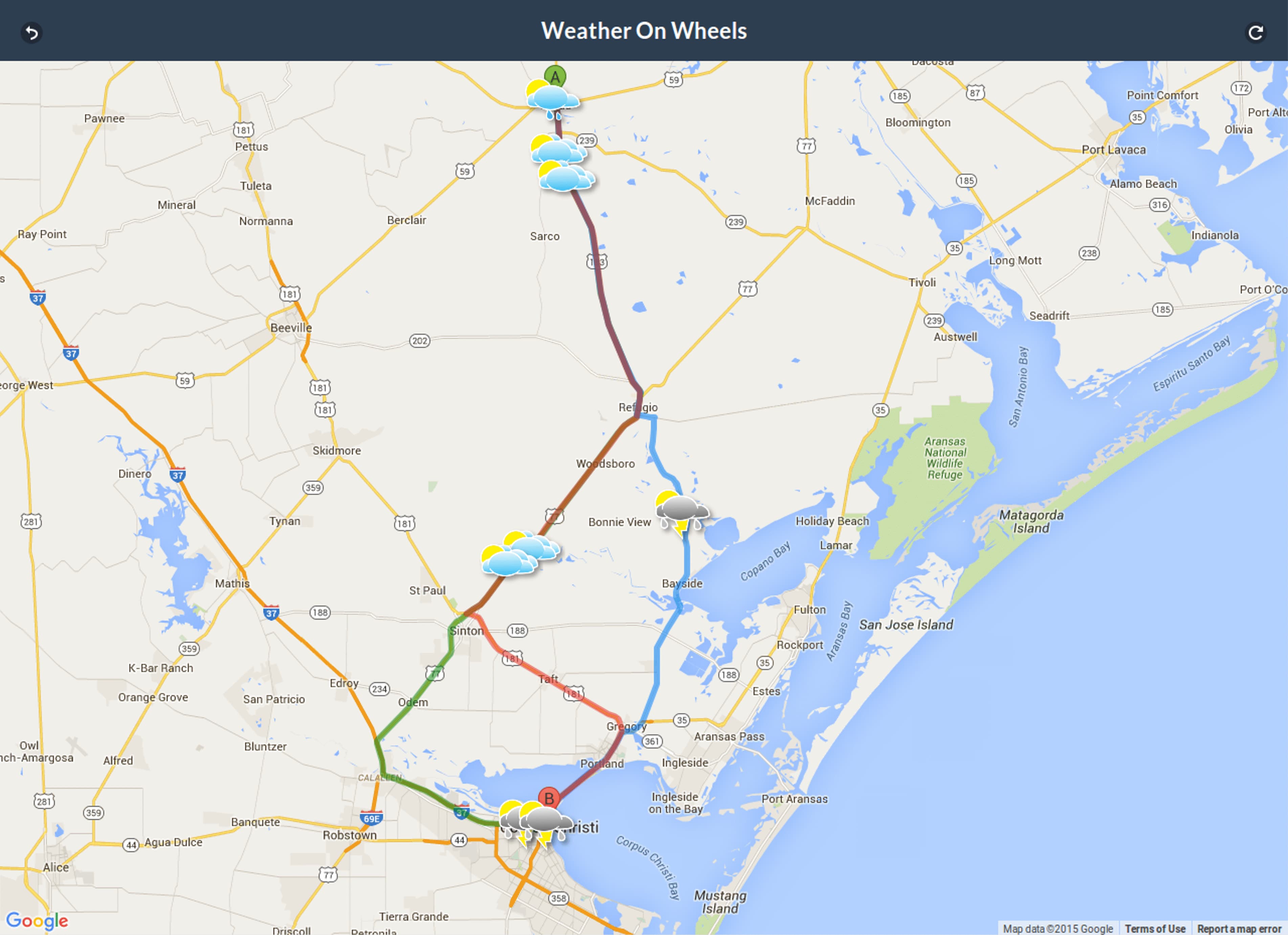 Use NowSource Code (3 KB)A project I contributed to at the Conrad Blucher Institute (CBI) that would give forecasted weather and severe weather events along a travel route. I worked with an existing codebase to improve speed, reliability, and implement additional features such as optional overlays for temperatures, precipitation levels, and windspeeds along a route. Weather On Wheels was available on a website and in the Android and Apple stores, but unfortunately, CBI no longer maintains the project and handed it off to another company that has left it nonfunctioning for a long time.